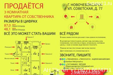 Квартира полностью готова к продаже!Читаем описание и знакомимся с планировкой (первое изображение) внимательно.Мы большая и дружная семья. Много лет мы жили в своем родном жилище, но дети выросли, разъехались, поэтому настало время прощаться. Мы продаем свою квартиру. Немного о самой квартире: - адрес: Советская, д. 77, под. 4, кв. 111 (вы можете проверить месторасположение дома сами, но инфраструктура, правда, отличная, рядом есть все, что необходимо);- 4 этаж в 10-этажном доме (в свое время пианино тащить было не так высоко, и не первый этаж с решетками); - квартира-распашонка (планировку вы можете видеть на первом изображении и, конечно, можете прийти «пощупать вживую», нам нечего скрывать);- квартира не торцевая;- квартира теплая;- квартира технически в исправном состоянии;- квартира действительно просторная;- это не новостройка с плохой звукоизоляцией (в этой квартире не слышно, что происходит в смежных квартирах; не слышно, что происходят этажами выше и ниже);- большой застекленный балкон;- санузел в кафеле;- в общем коридоре имеется кладовая под ключ, место для хранения велосипедов;- соседи дружелюбные, спокойные, семейные люди.Немного о стоимости квартиры:Хотелось бы уточнить, что мы продаем не ультрамодный дизайн интерьера (тут уж на вкус и цвет товарища нет), мы продаем квадратные метры!И цена квадратного метра (тут я думаю, ни у кого не возникнет проблем с математикой) составляет меньше 35000 рублей (что даже при простом анализе рынка недвижимости дает понимание о лучшей цене в соотношении качества). Если объявление находится здесь, оно является актуальным.Будем рады видеть у себя действительно заинтересованных людей!